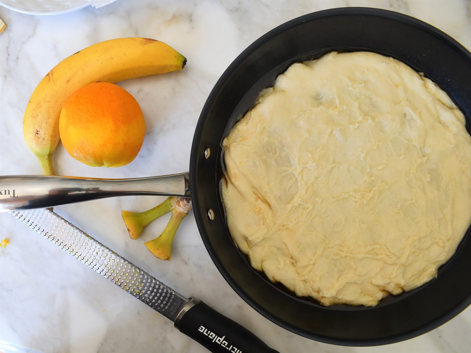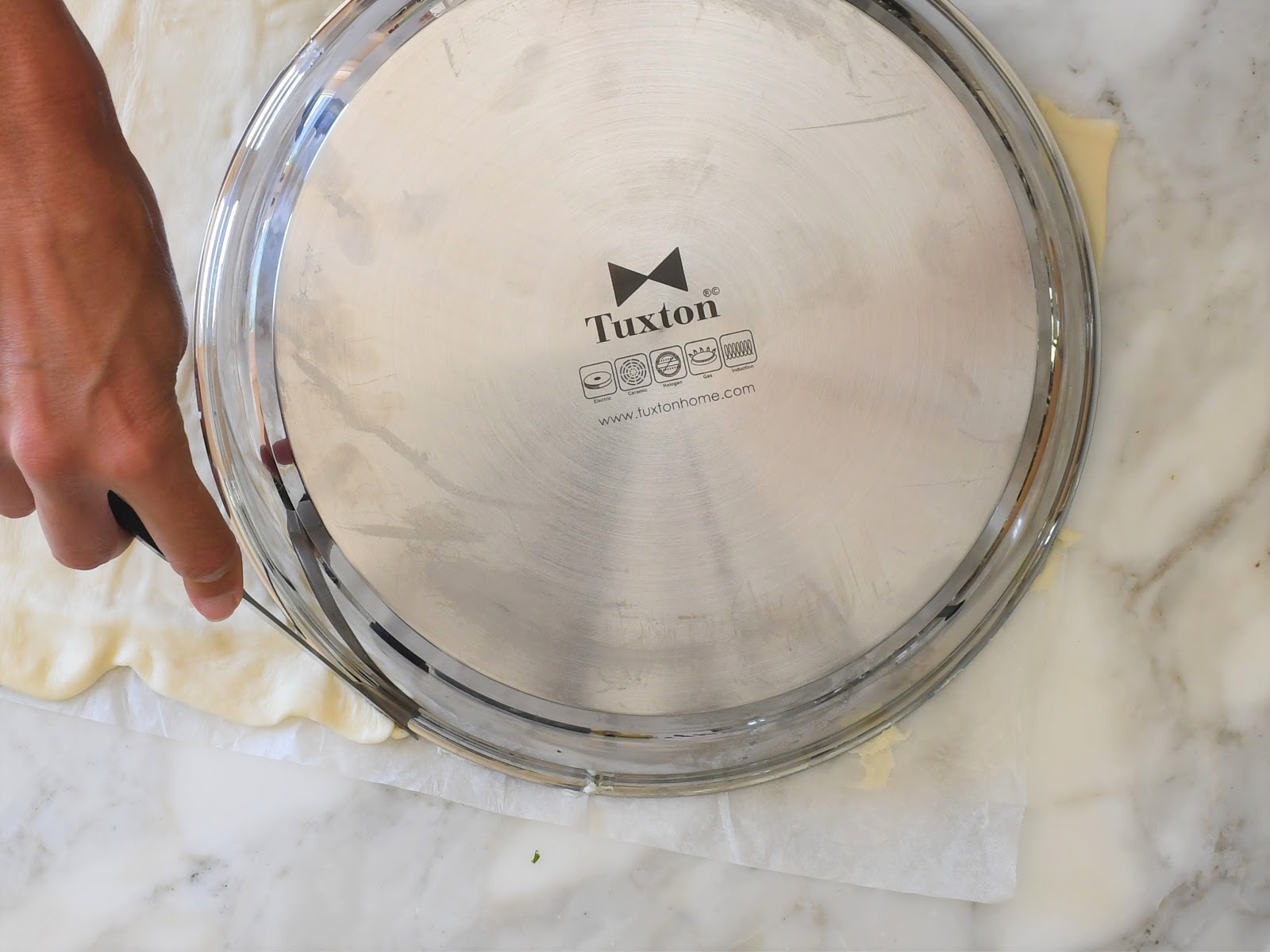 Preheat the oven to 400°F (200°C). If necessary cut the puff pastry sheet into a circle using the top of your skillet (place it upside down on the dough and cut with a knife around the edge).