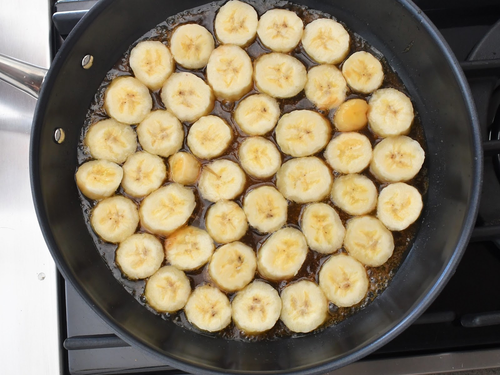 Remove from the heat and add the banana slices in one layer over the caramel.